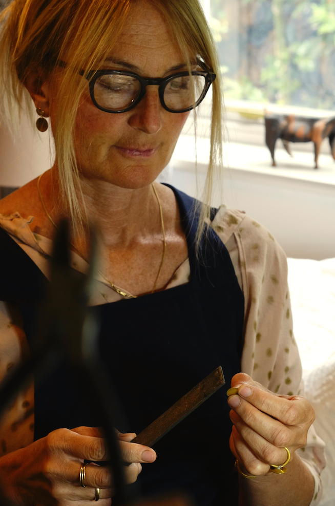 Alba Jewellery is all handmade by Jacqueline Dawson, in her garden workshop at home in Suffolk. Jacqueline works in recycled metals; brass, gold and silver, enjoying the fact that these metals have had previous lives and can now be appreciated for their natural raw beauty.Inspiration is taken from the natural world: plants from the local marshes, seaweeds, leaves, seeds and flowers, the sun, moon and stars, and bodies of water are all to be found in the collections.Observational sketches are first simplified, then worked up into paper maquettes before being formed from metal, or formed directly in jewellers wax to be cast in recycled metal. Most fabricated pieces are textured using hammering as a finish - the tiny hammer marks bringing out the depth of colour in the metal as it catches the light. Using age-old techniques and simple hand tools, the pieces celebrate the beauty of nature, the uniqueness of the handmade, and the authenticity of raw metal.