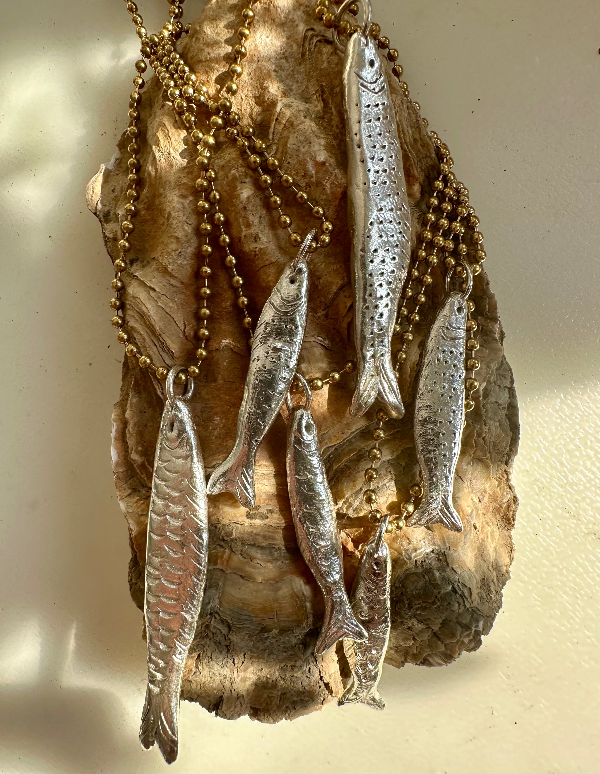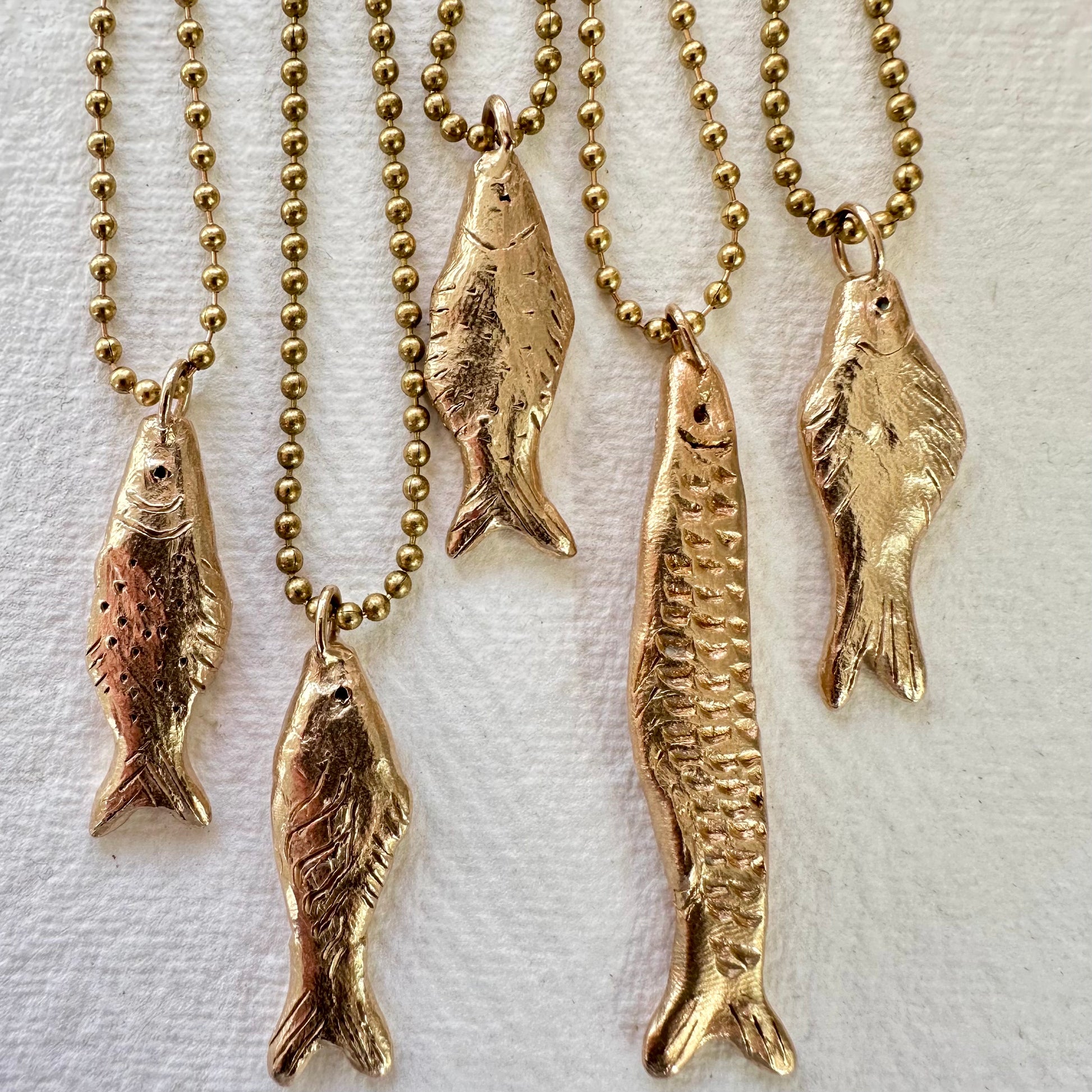 They have a pleasing weight to them, yet are comfortable to wear and hang from a long brass ball chain of 80cm for the large and 70cm for the small. The large fish themselves are approx. 6 cm in length and the small are approx. 4cm.