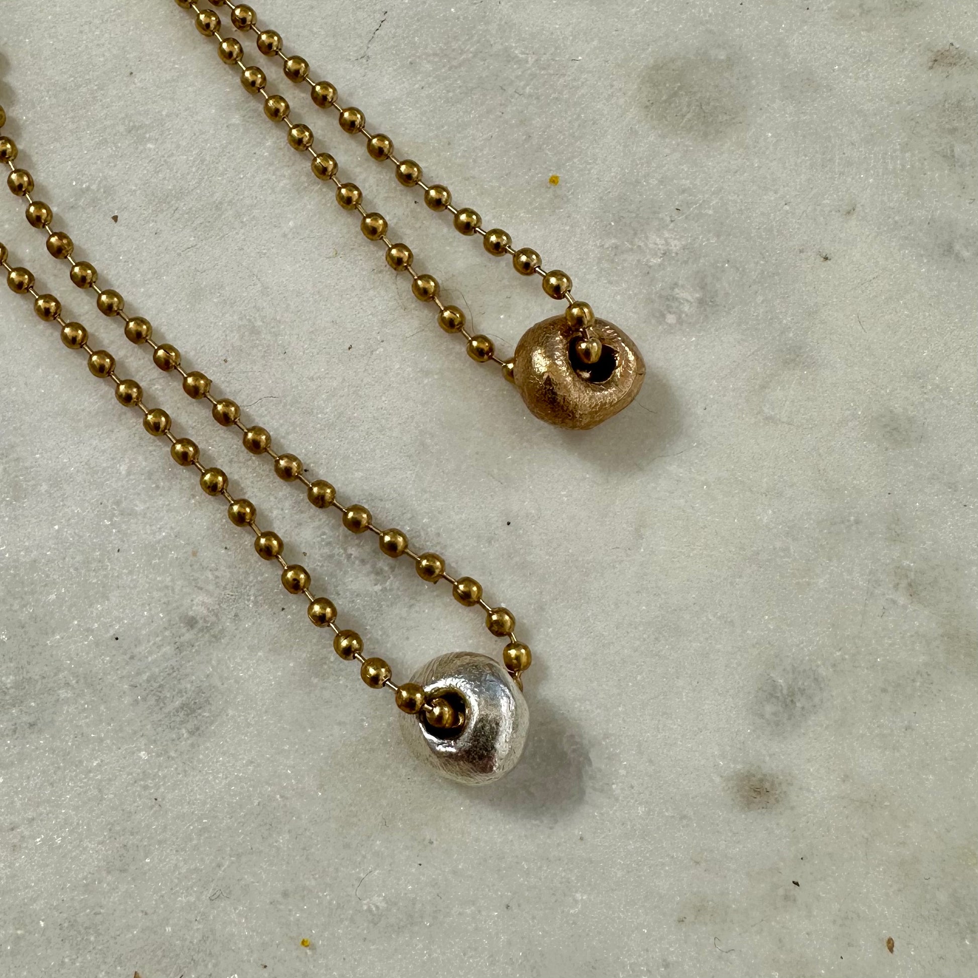 My version has been carved in wax and cast in recycled brass or recycled silver. I carve each one individually, replicating one from my collection - so each one is different and unique - like the stones themselves. They have a pleasing texture and weight to them and hang from 75cm (large) 70cm (small) 65cm (mini) of brass ball chain.
