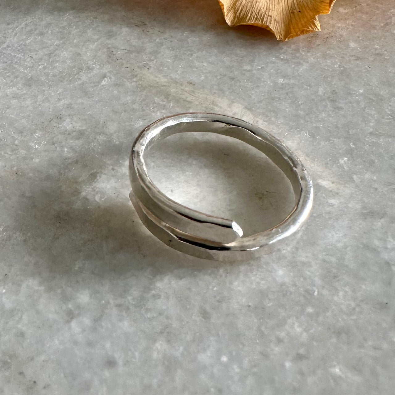A thicker and textured spiral ring with rounded ends: a spiral of hammered 2.5mm wide recycled silver. Handmade sustainably in Suffolk.
