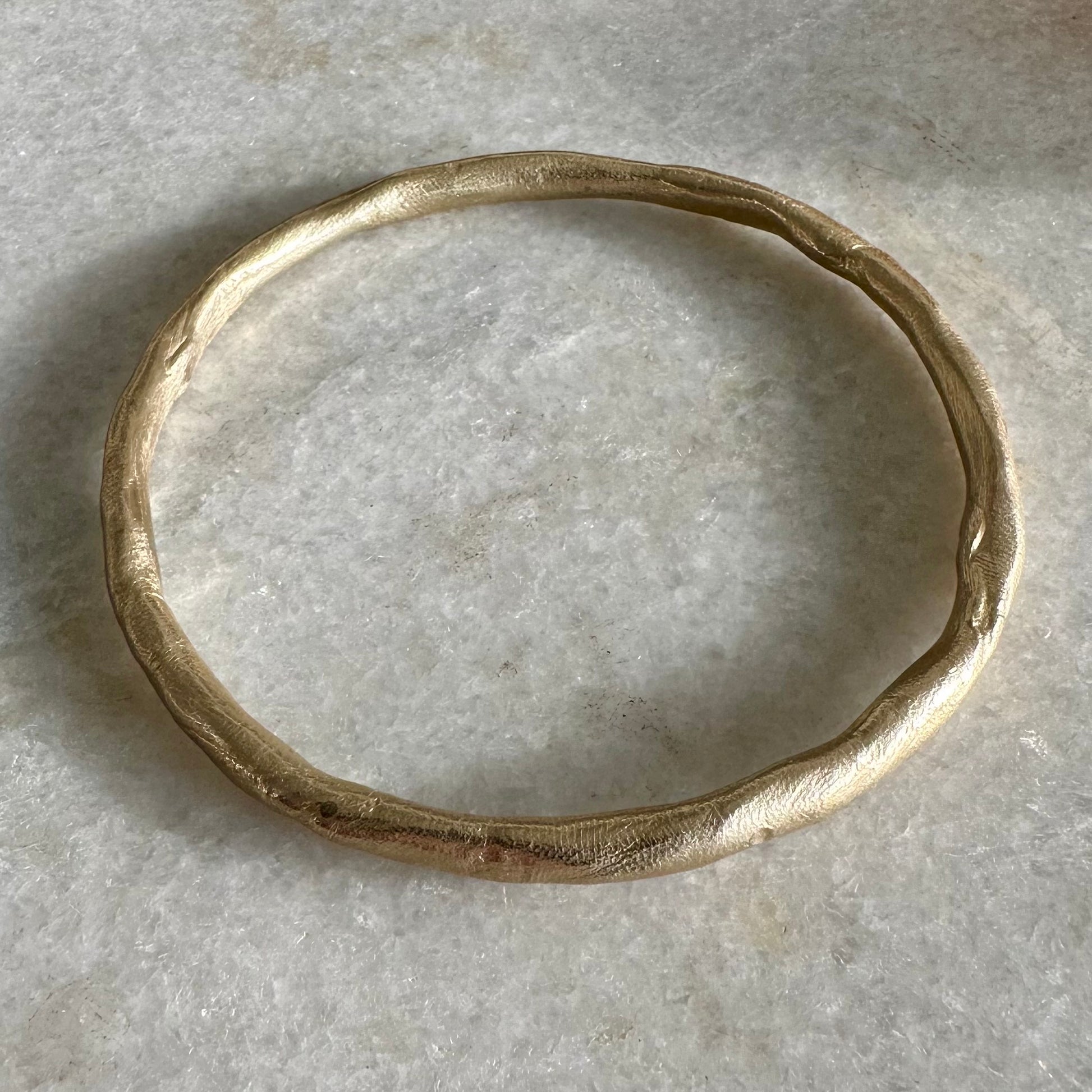 A gorgeous wobbly and characterful chunky bangle. It has been hand carved in wax then cast in solid recycled brass or silver giving it a pleasing, but comfortable, weight.