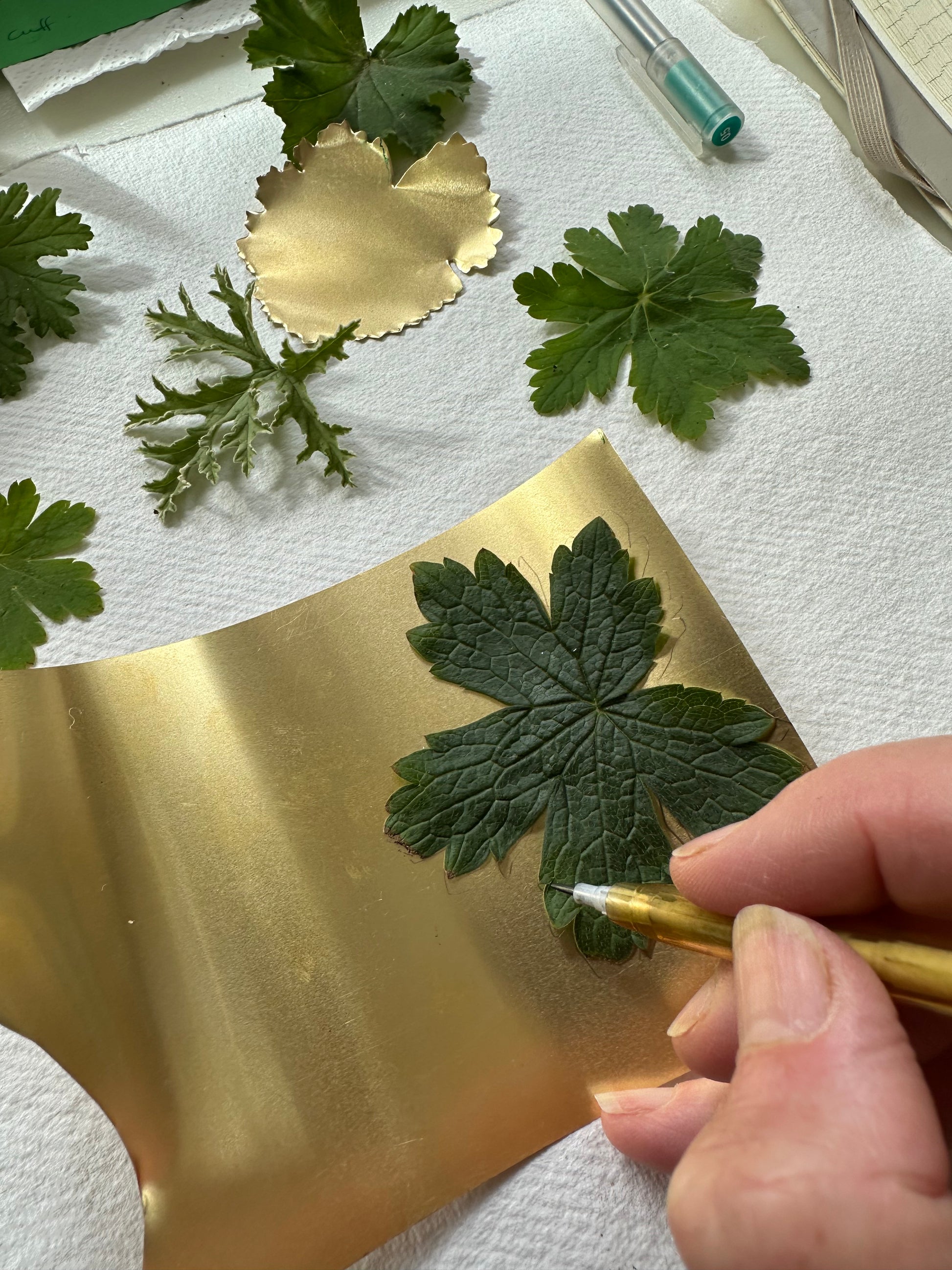 Come and make a beautiful brass wreath - a sustainably made decoration to keep forever and bring out year after year to brighten the darker days. We will use leaves I have dried, or any you may wish to bring, to draw around and cut from brass sheet. Leaves with an undulating outline work the best, such as geranium or oak leaves. We will texture and score the leaves to add interest and allow them to catch the light beautifully. Each leaf will be wired on to a brass wire hoop and arranged as you wish. They make a beautiful decoration for a door or wall on placed on a table with a candle in the centre.